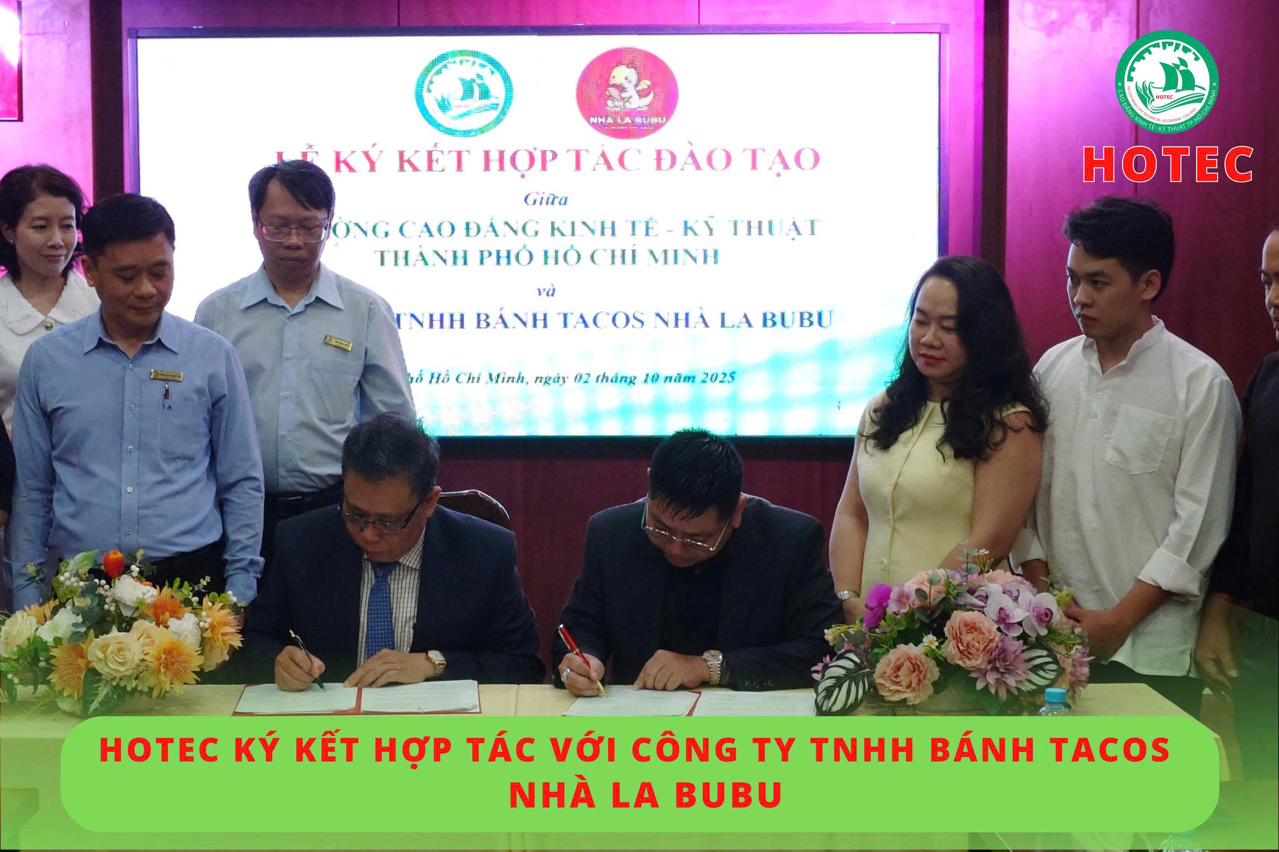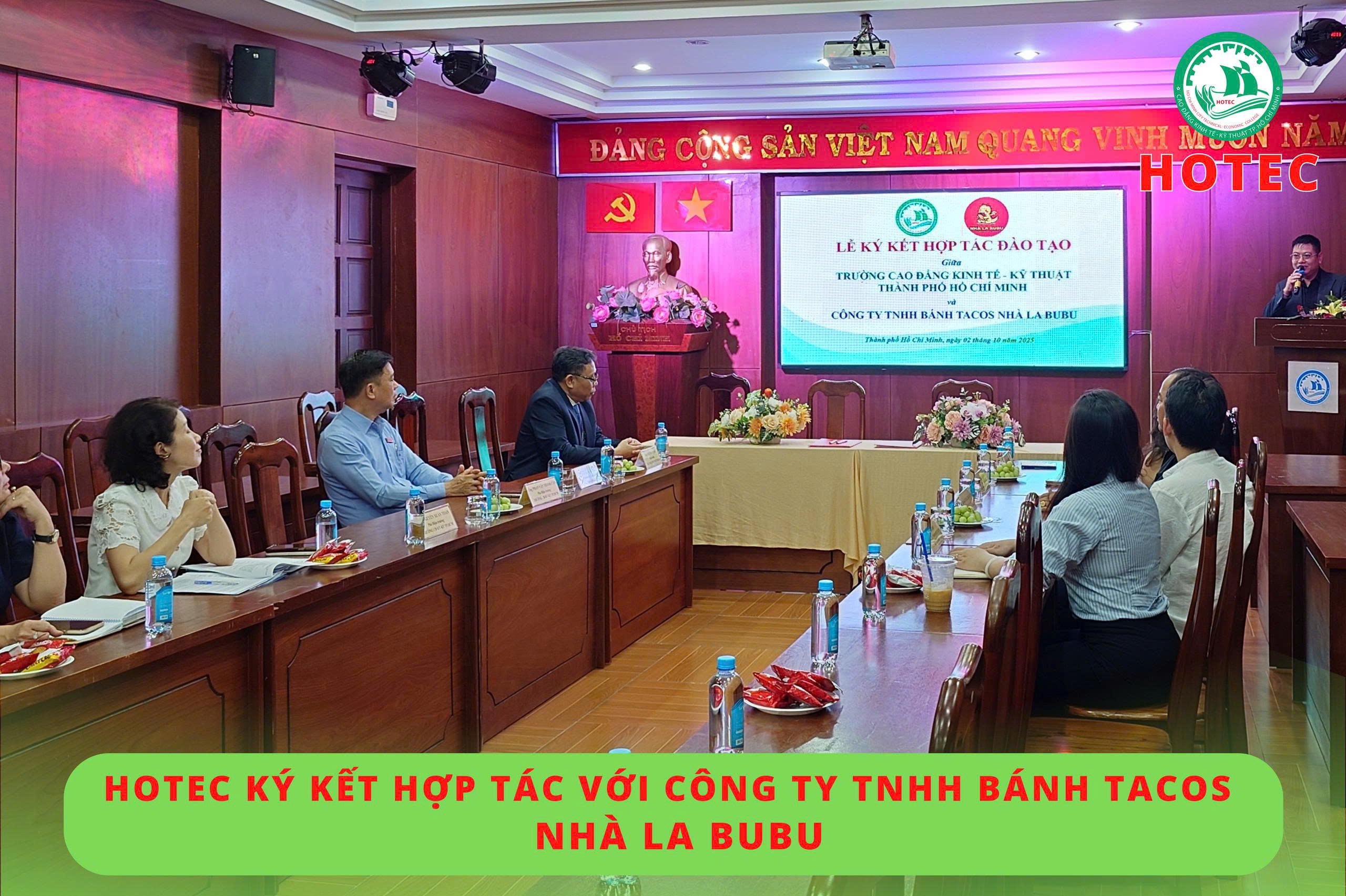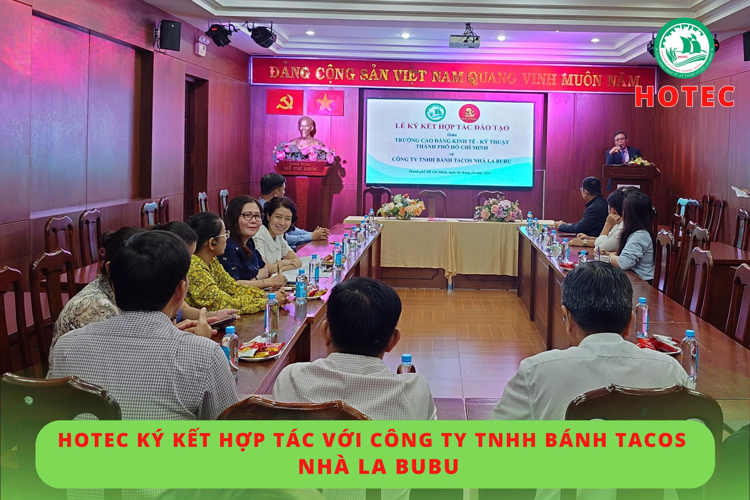 Sáng ngày 02/10/2025, tại phòng họp A1-8, Trường Cao đẳng Kinh tế – Kỹ thuật TP. Hồ Chí Minh (HOTEC) đã tổ chức lễ ký kết hợp tác với Công ty TNHH Bánh Tacos Nhà La BuBu. Mục tiêu của buổi ký kết này là thiết lập mối quan hệ hợp tác lâu dài, triển khai các chương trình đào tạo ngắn hạn trong lĩnh vực nhà hàng – khách sạn, đồng thời thúc đẩy hoạt động trao đổi chuyên môn và khai thác tối đa thế mạnh, nguồn lực của mỗi bên.