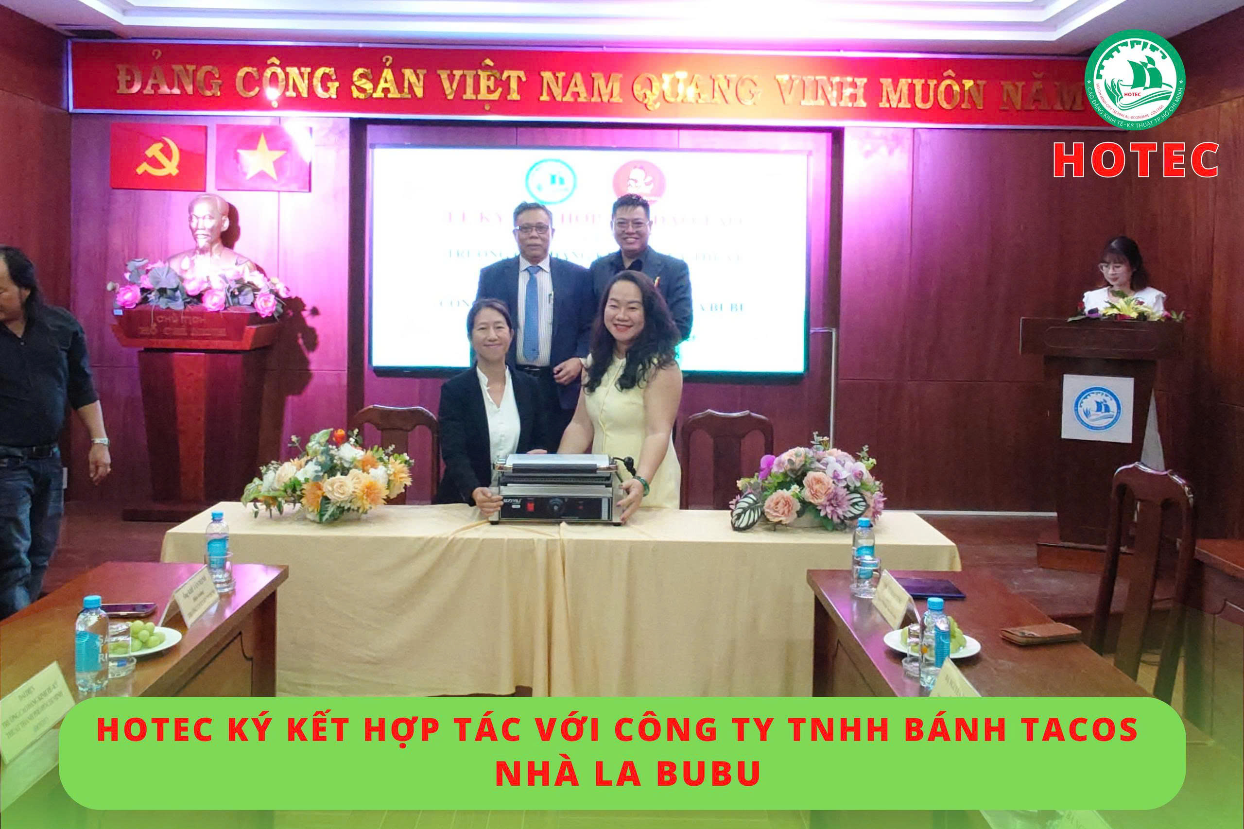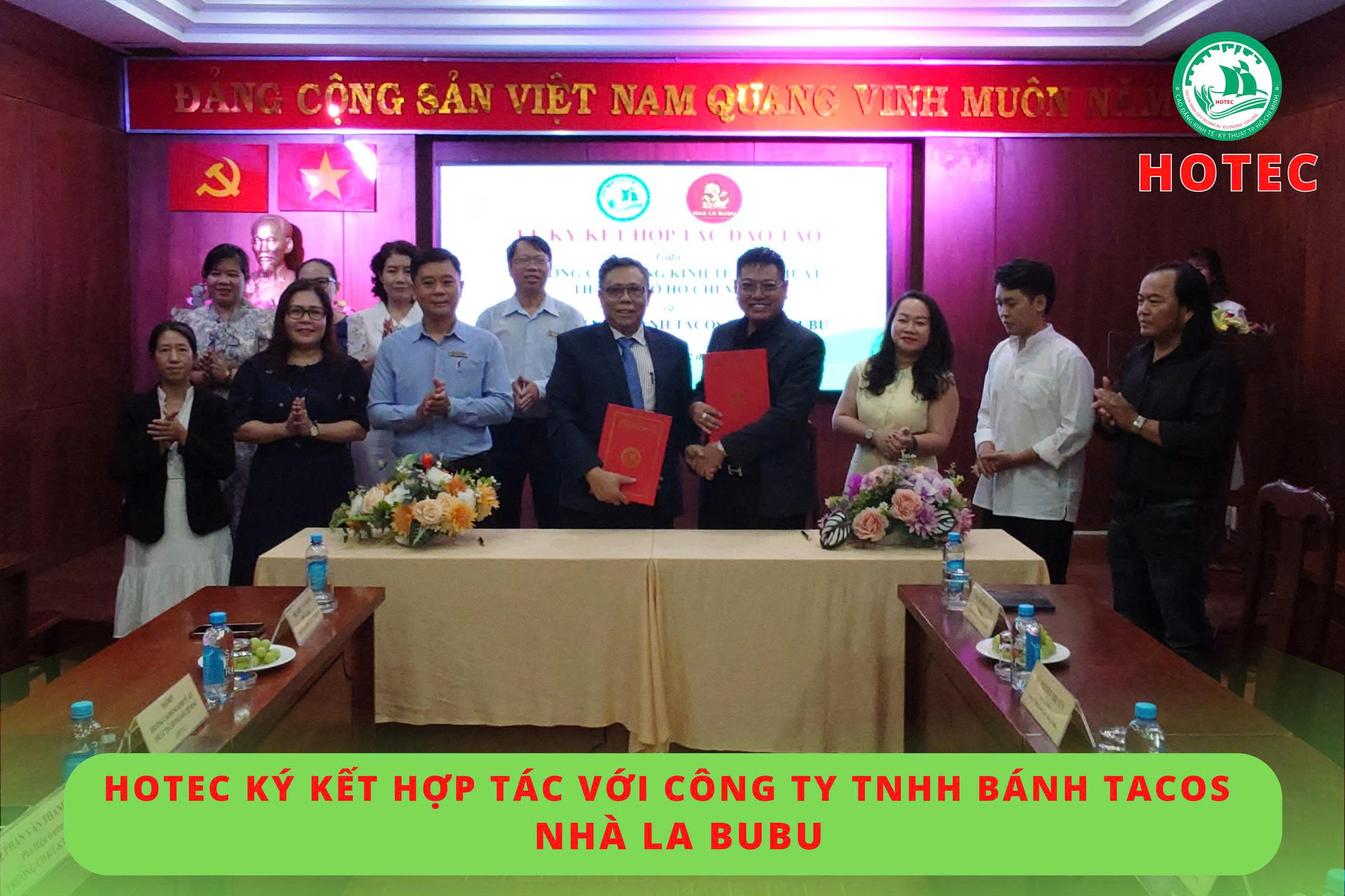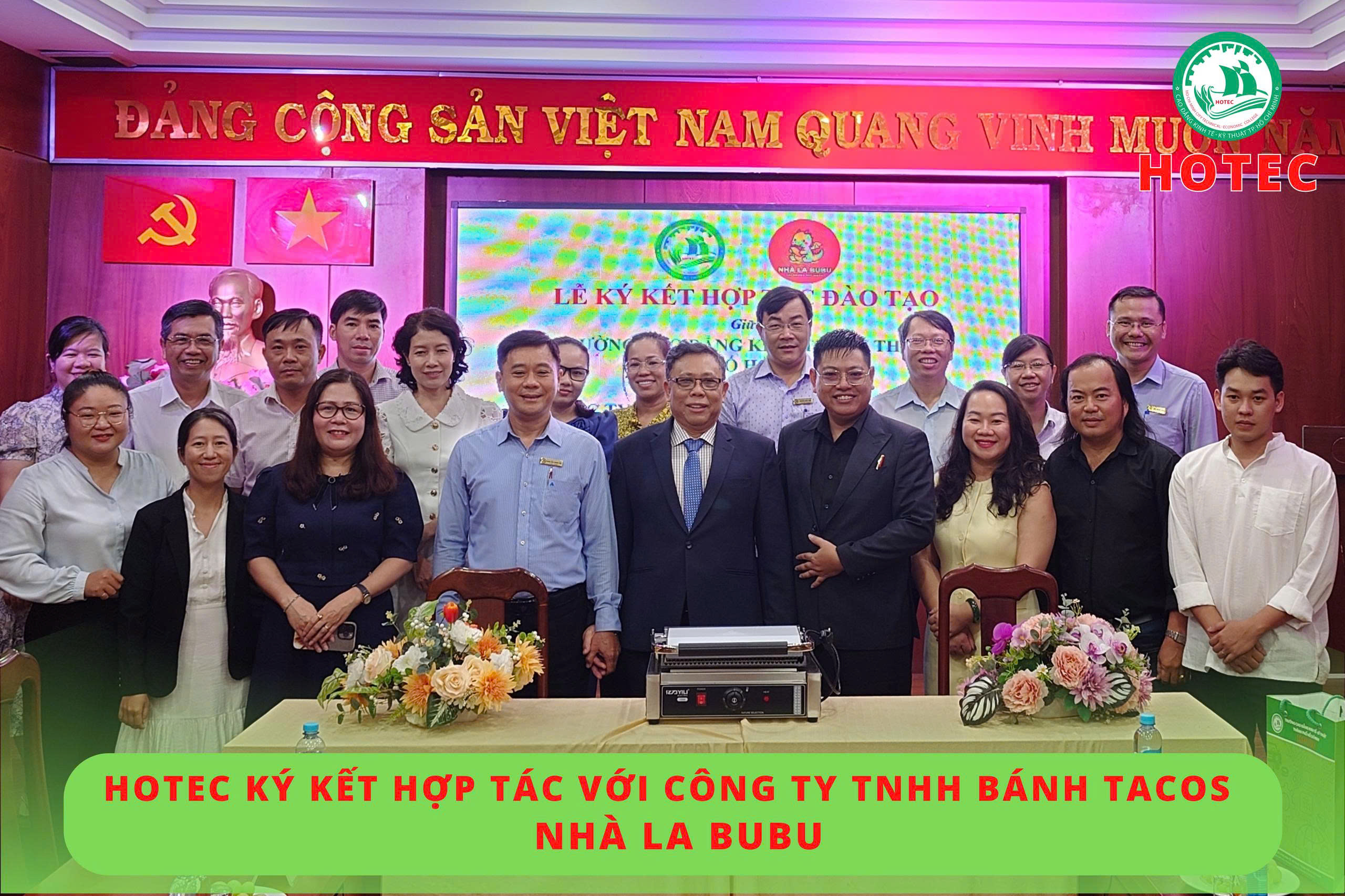Sáng ngày 02/10/2025, tại phòng họp A1-8, Trường Cao đẳng Kinh tế – Kỹ thuật TP. Hồ Chí Minh (HOTEC) đã tổ chức lễ ký kết hợp tác với Công ty TNHH Bánh Tacos Nhà La BuBu. Mục tiêu của buổi ký kết này là thiết lập mối quan hệ hợp tác lâu dài, triển khai các chương trình đào tạo ngắn hạn trong lĩnh vực nhà hàng – khách sạn, đồng thời thúc đẩy hoạt động trao đổi chuyên môn và khai thác tối đa thế mạnh, nguồn lực của mỗi bên.