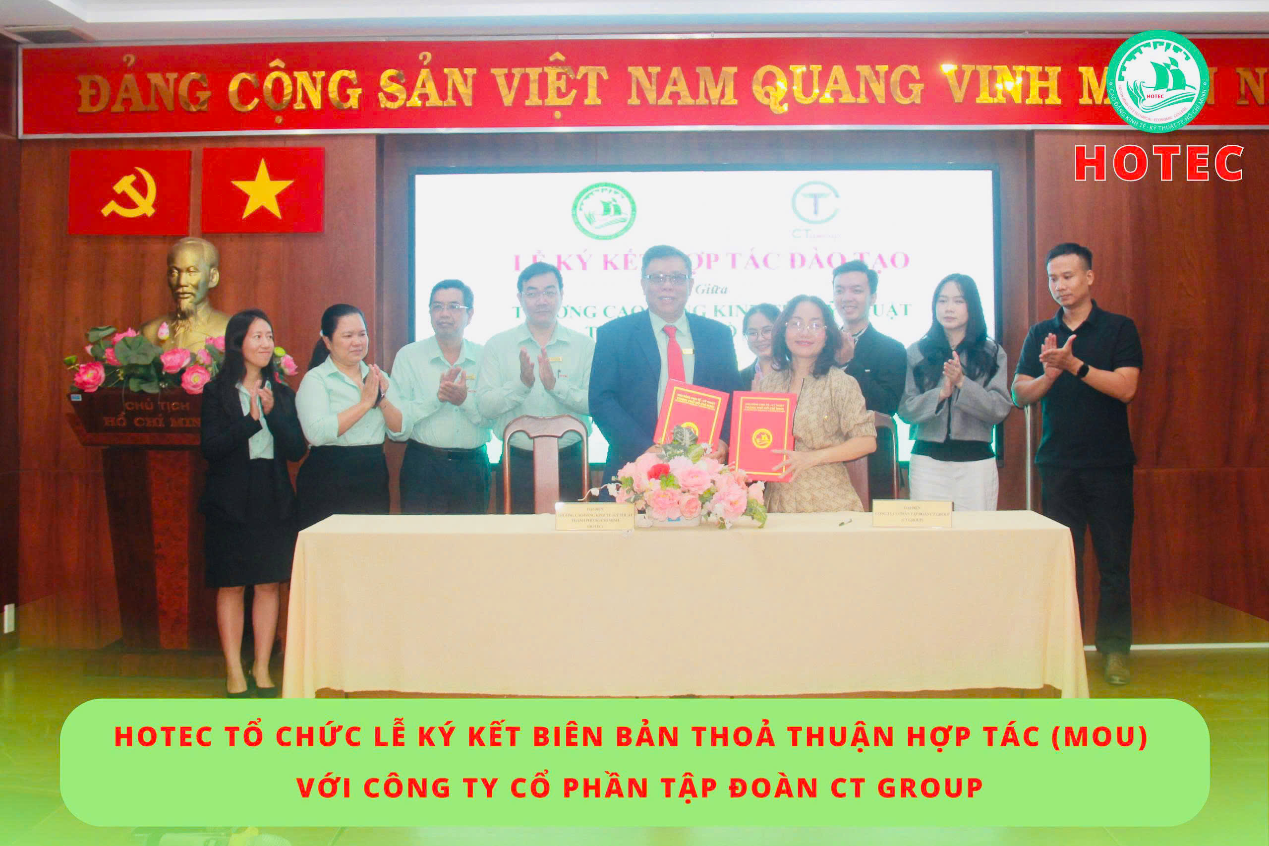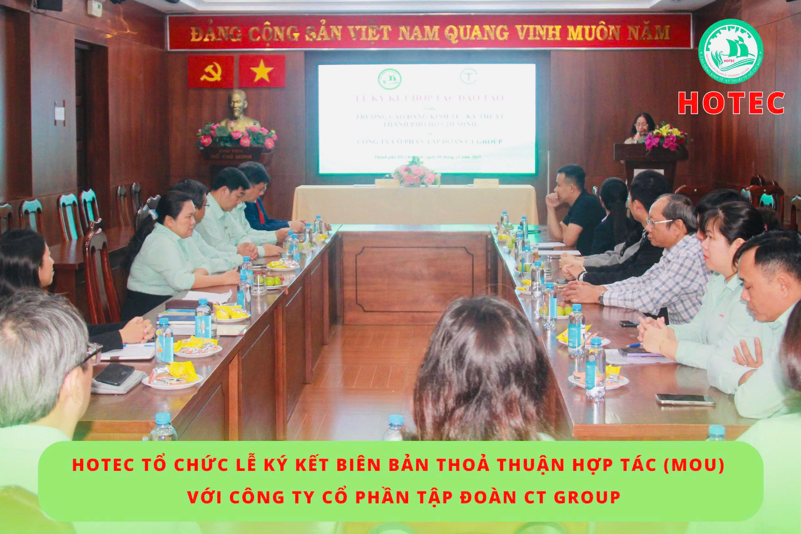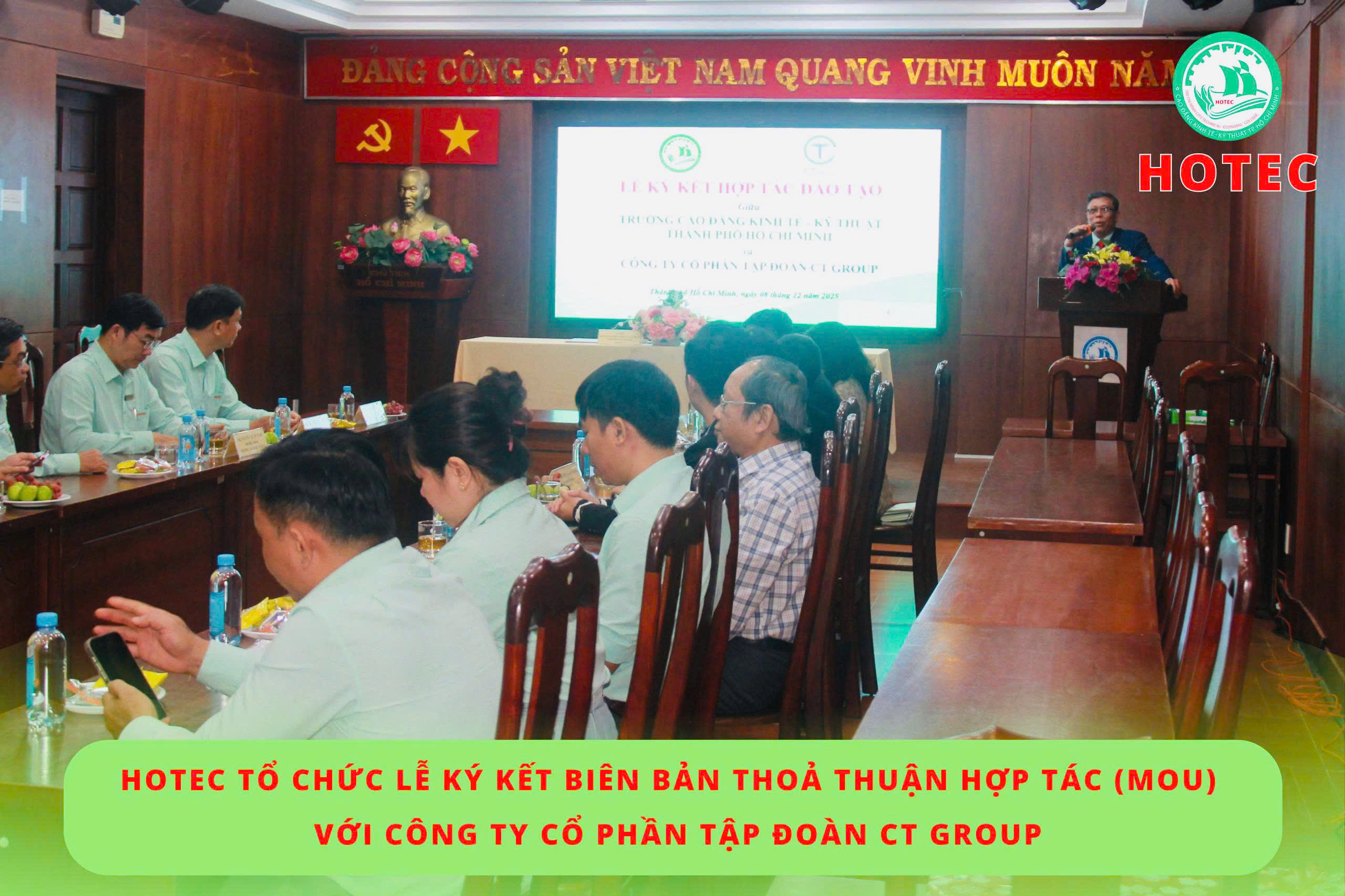 Sáng ngày 08/12/2025, Trường Cao đẳng Kinh tế – Kỹ thuật TP. Hồ Chí Minh (HOTEC) long trọng tổ chức Lễ ký kết Biên bản thỏa thuận hợp tác (MOU) với Công ty Cổ phần Tập đoàn CT Group. Buổi lễ diễn ra trong không khí trang trọng, thể hiện quyết tâm của hai đơn vị trong việc tăng cường gắn kết giữa nhà trường và doanh nghiệp, hướng đến mục tiêu phát triển nguồn nhân lực chất lượng cao, đáp ứng nhu cầu thực tiễn của xã hội.