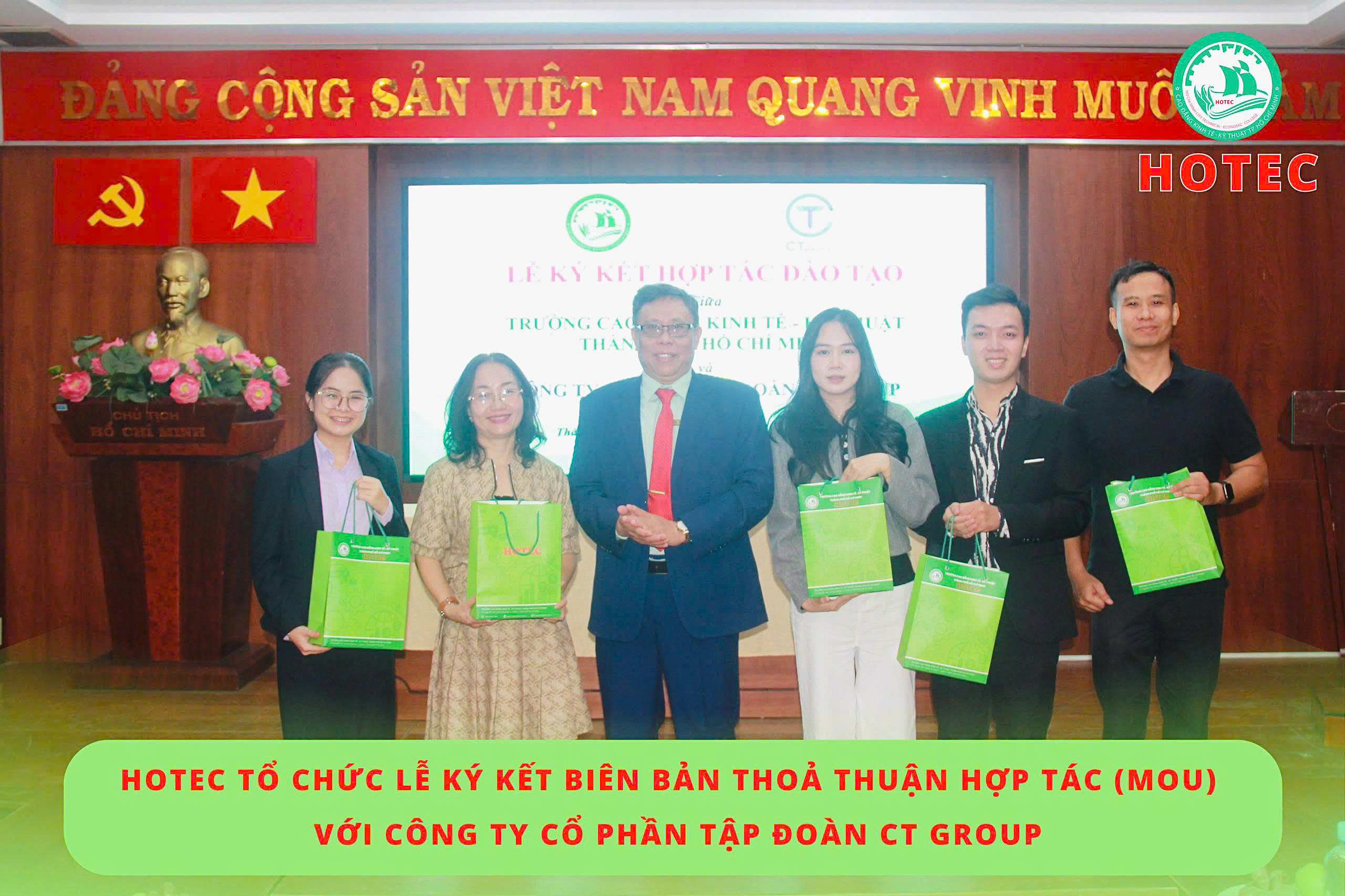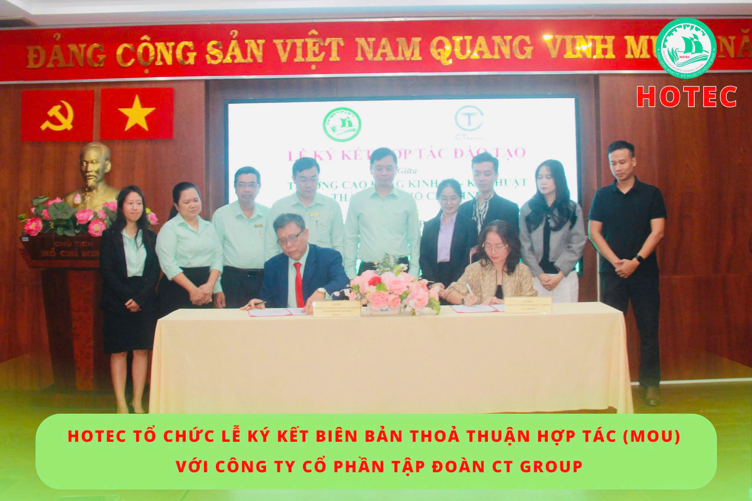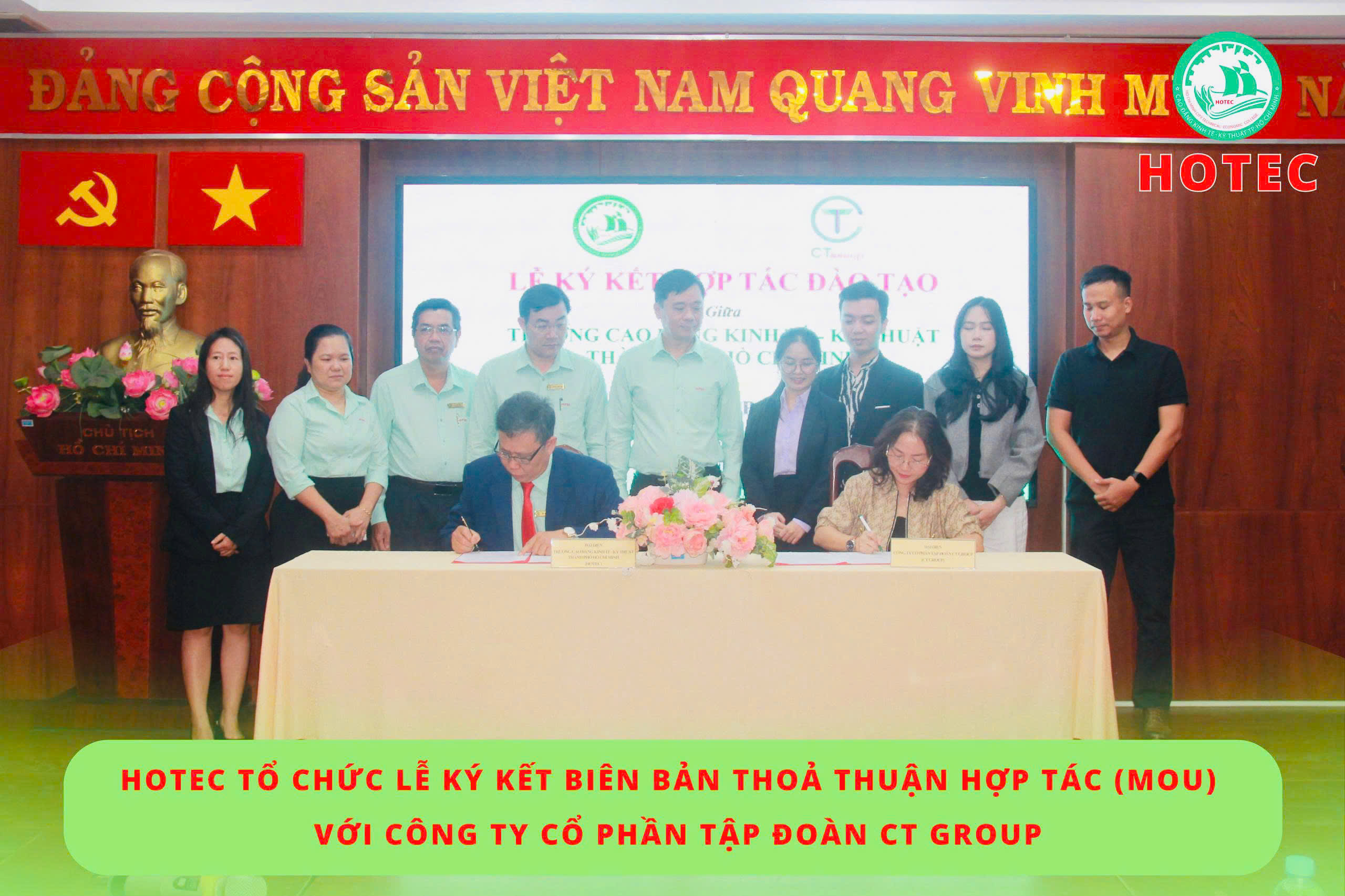 Sáng ngày 08/12/2025, Trường Cao đẳng Kinh tế – Kỹ thuật TP. Hồ Chí Minh (HOTEC) long trọng tổ chức Lễ ký kết Biên bản thỏa thuận hợp tác (MOU) với Công ty Cổ phần Tập đoàn CT Group. Buổi lễ diễn ra trong không khí trang trọng, thể hiện quyết tâm của hai đơn vị trong việc tăng cường gắn kết giữa nhà trường và doanh nghiệp, hướng đến mục tiêu phát triển nguồn nhân lực chất lượng cao, đáp ứng nhu cầu thực tiễn của xã hội.