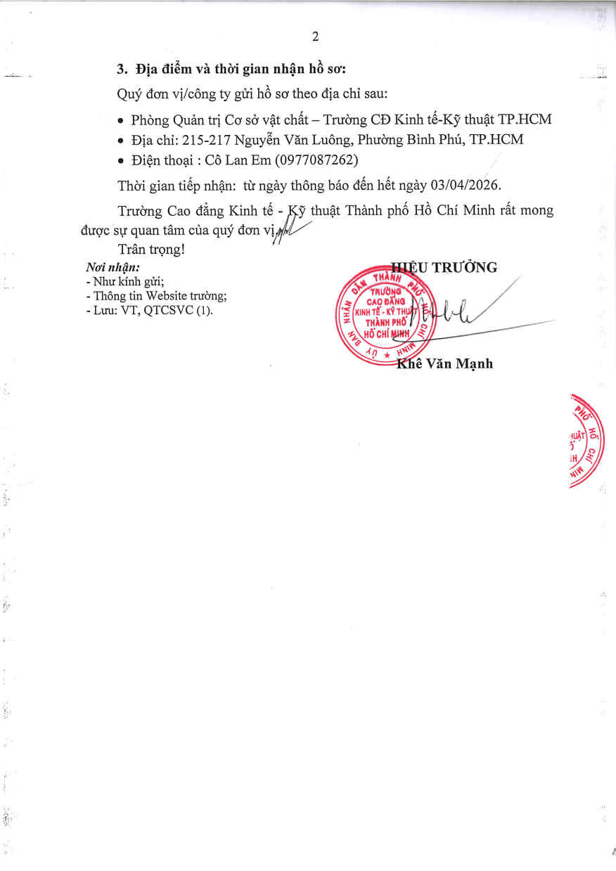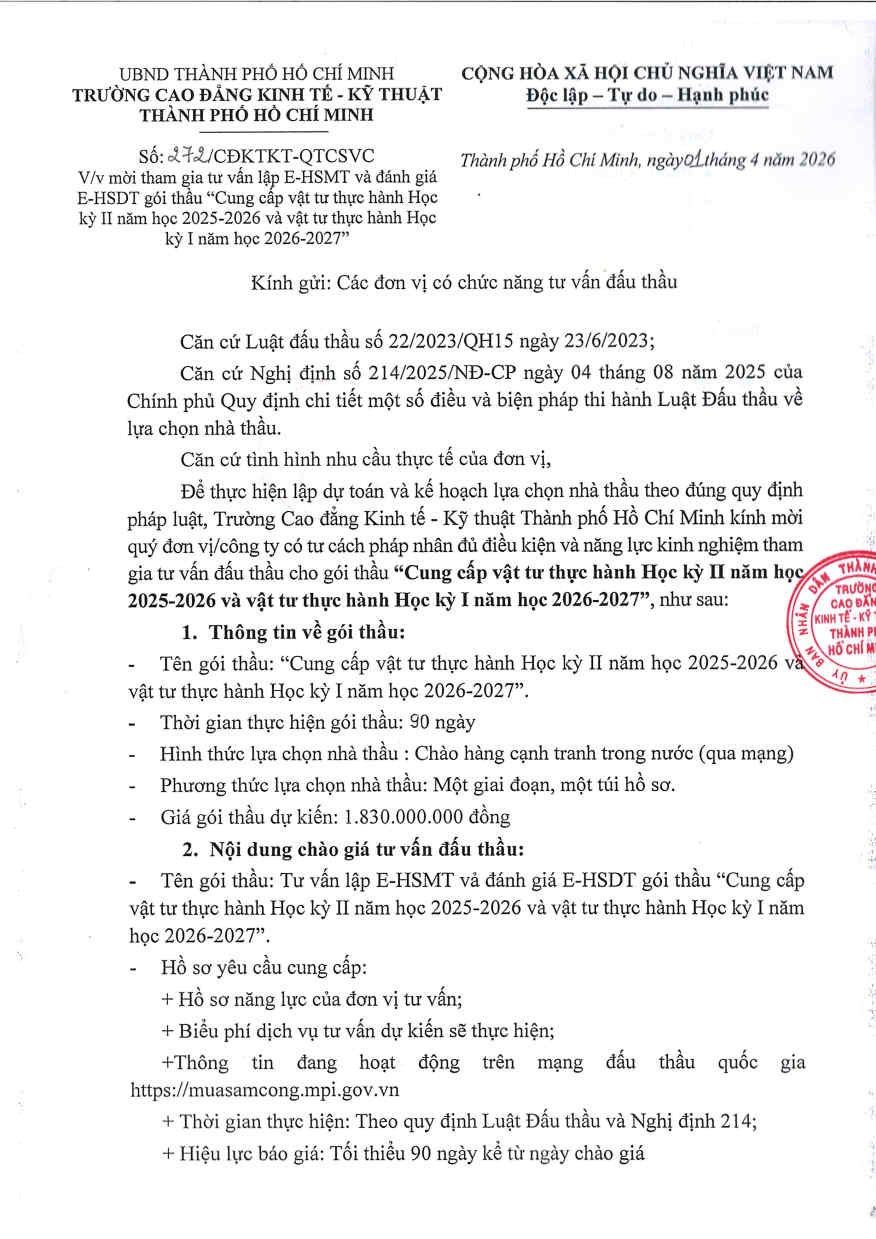 Trường Cao đẳng Kinh tế – Kỹ thuật Thành phố Hồ Chí Mính kính mời các đơn vị/công ty tư vấn đấu thầu có quan tâm tham gia tư vấn đấu thầu cho gói thầu Cung cấp vật tư thực hành Học kỳ II năm học 2025-2026 và vật tư thực hành Học kỳ I năm học 2026-2027″ của Nhà trường, như sau: