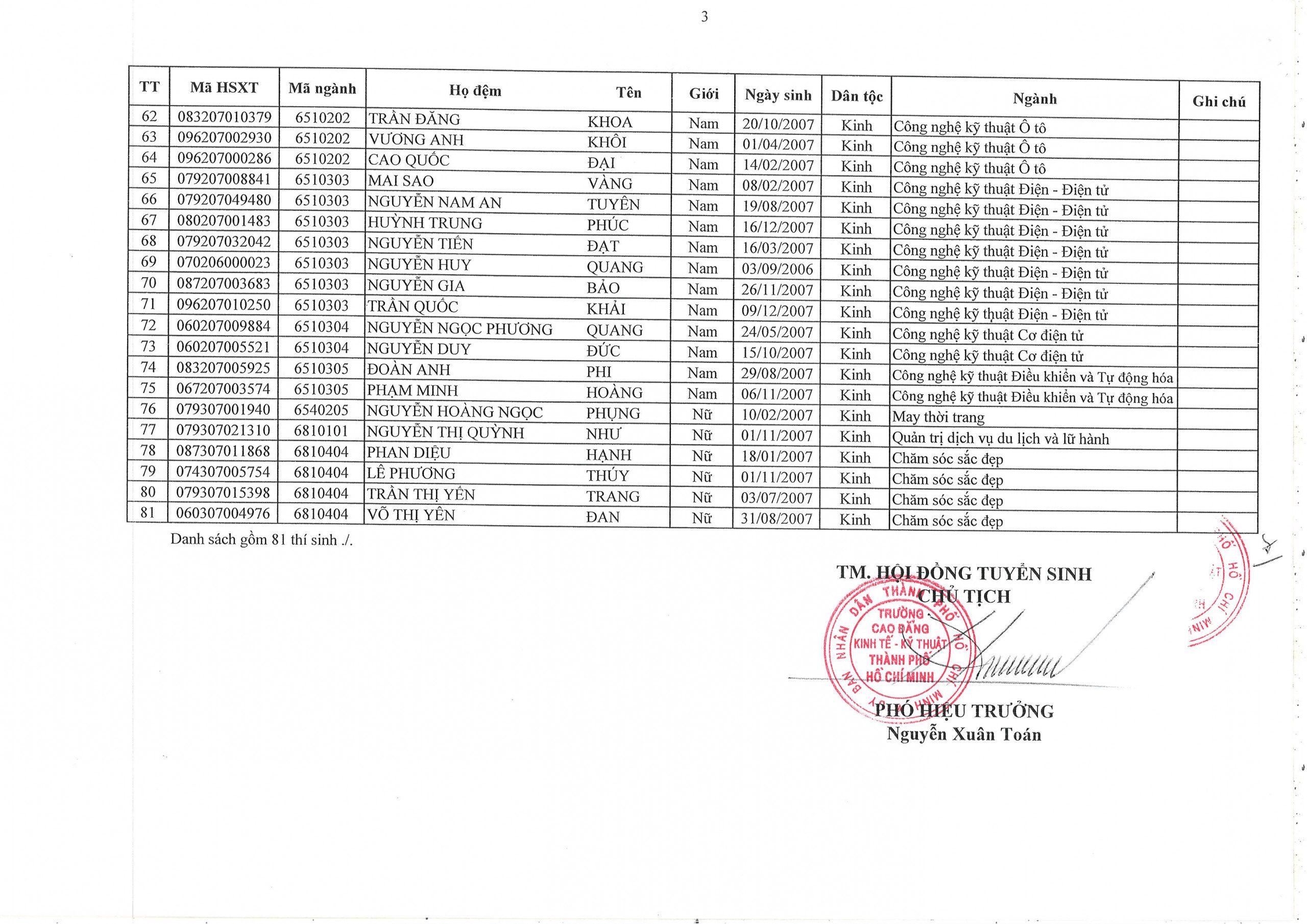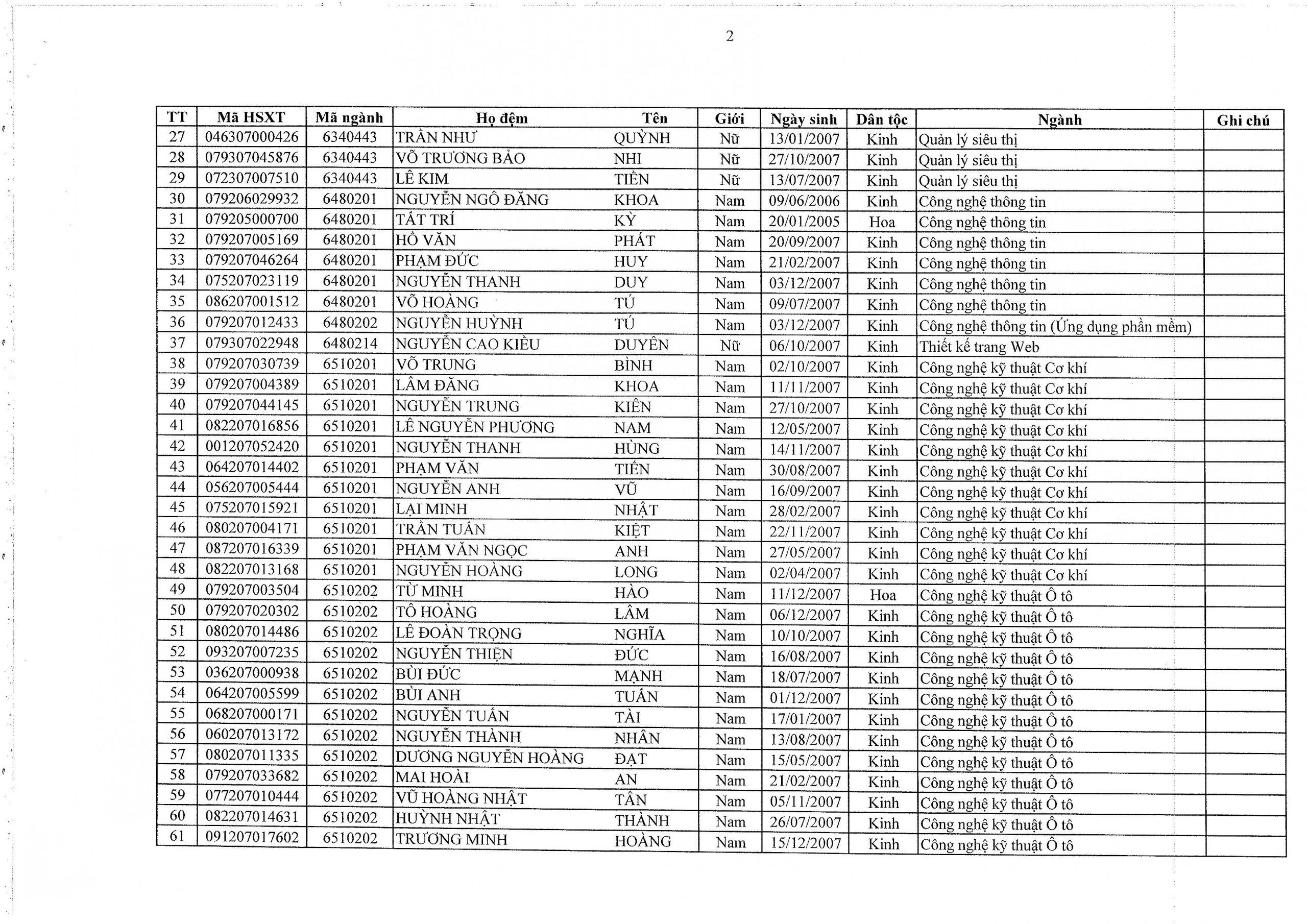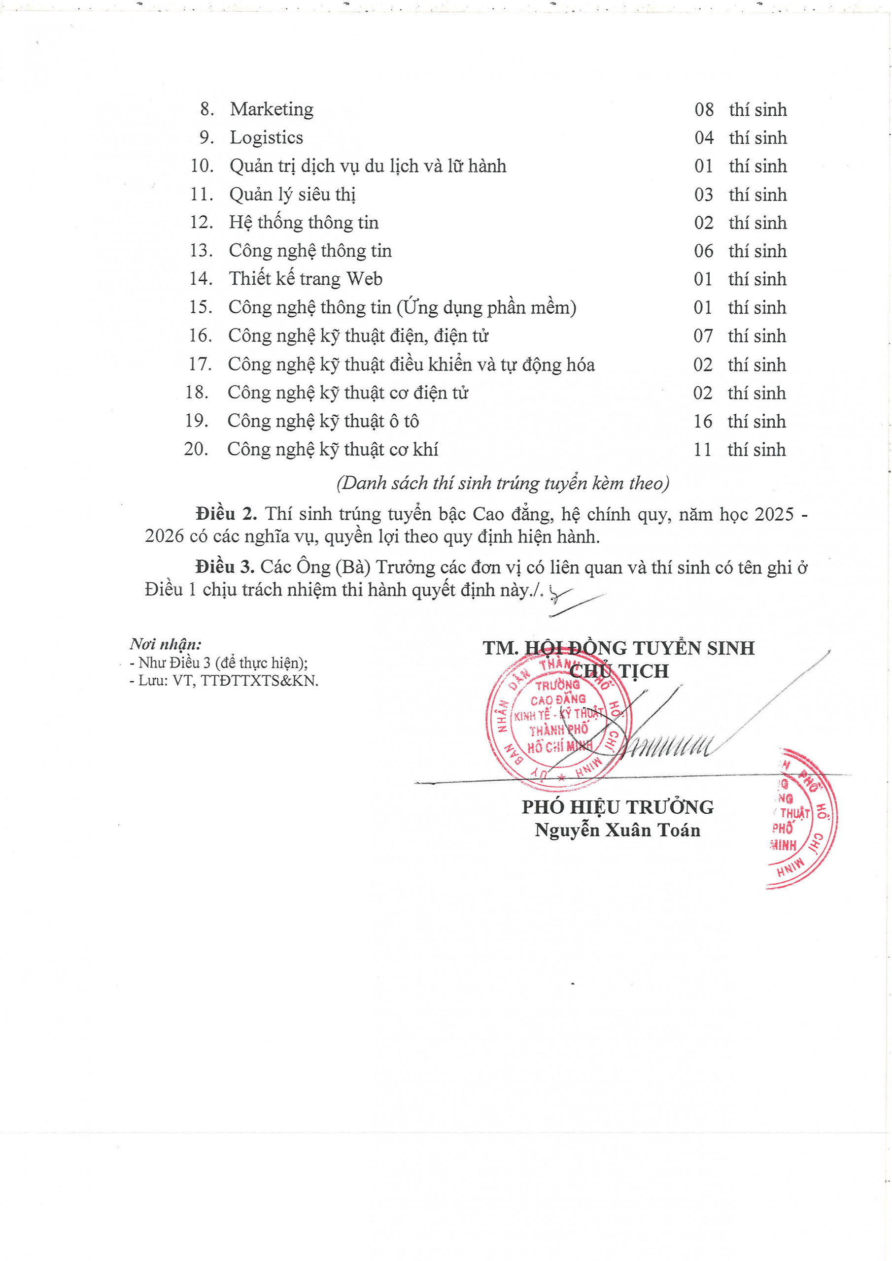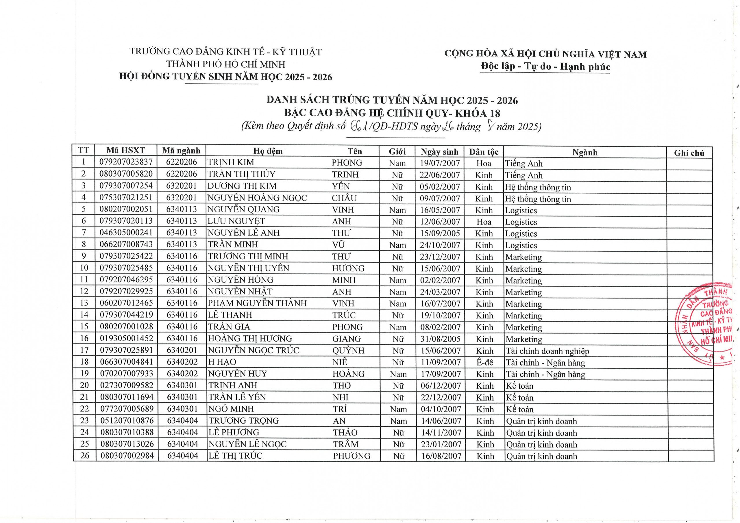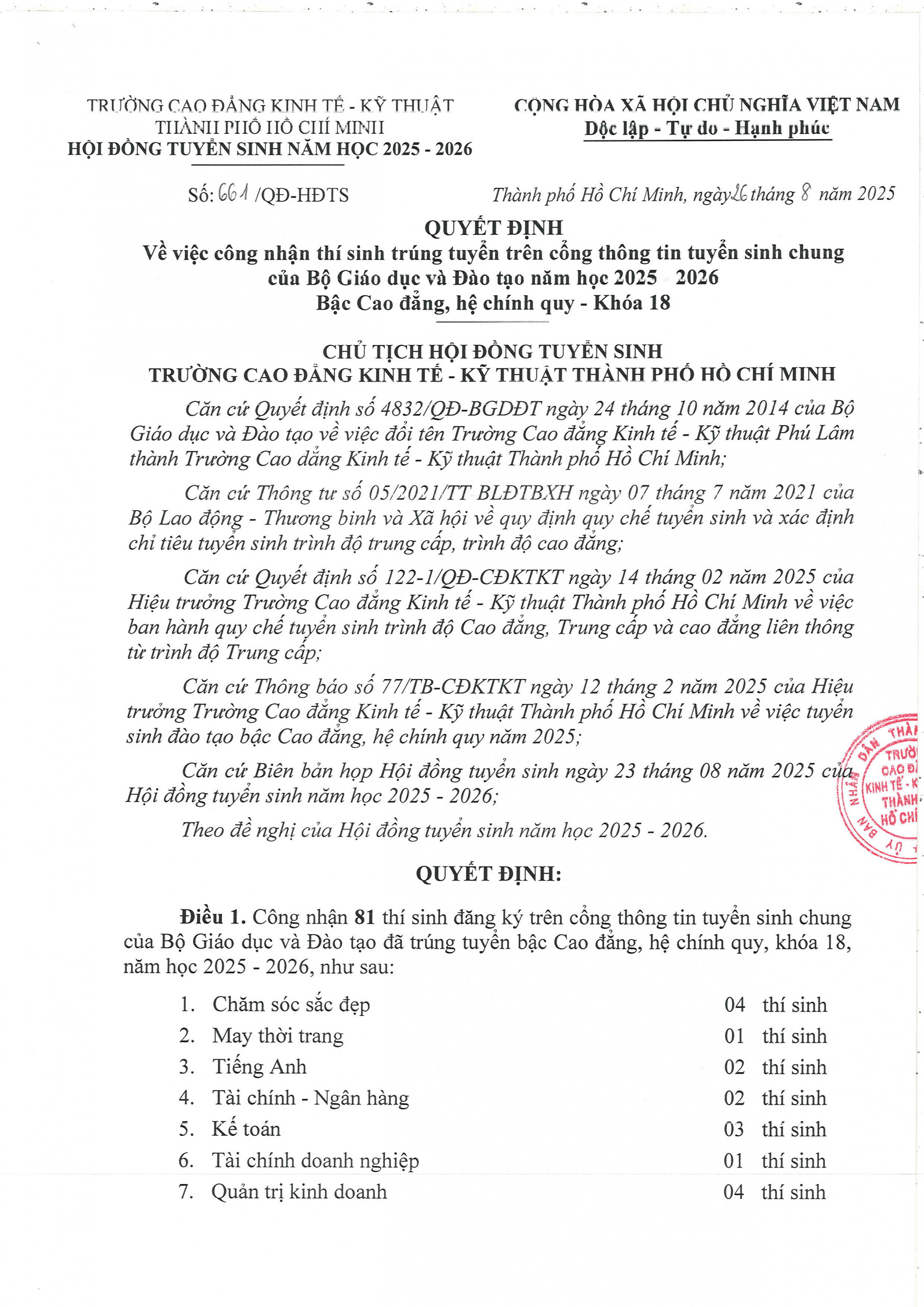 Quyết định công nhận thí sinh trúng tuyển Bậc Cao đẳng (hệ thống BGD) hệ chính quy – Khóa 18 năm học 2025 – 2026