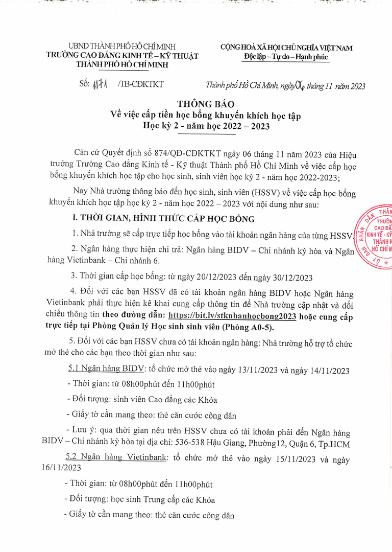 Thông báo về việc cấp tiền học bổng khuyến khích học tập Học kỳ 2 – năm học 2022 – 2023 – TB1171