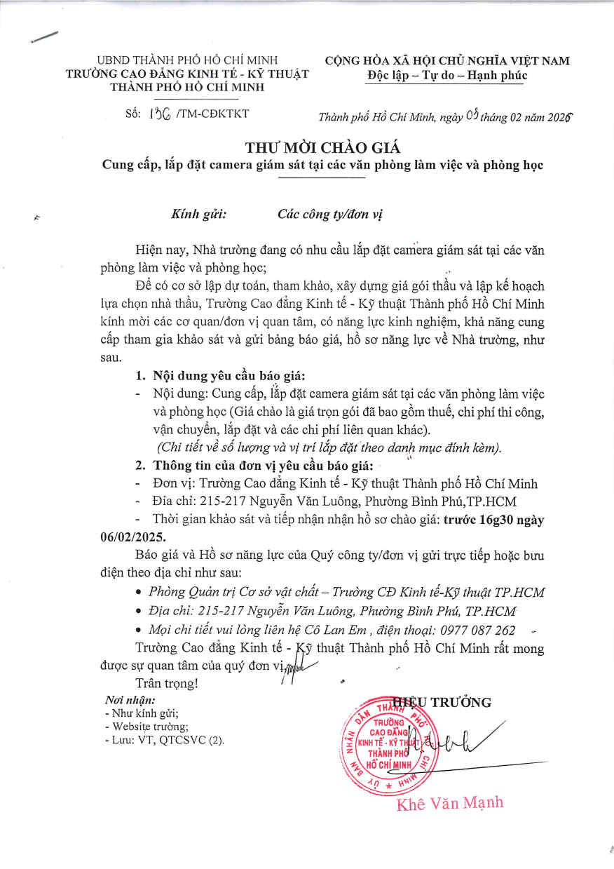 Thư mời chào giá Cung cấp, lắp đặt camera giám sát tại các phòng làm việc, phòng học