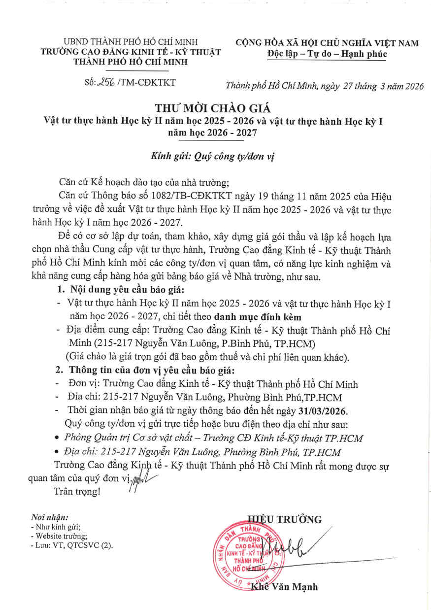 Trường Cao đẳng Kinh tế – Kỹ thuật Thành phố Hồ Chí Minh kính mời đơn vị/công ty quan tâm tham gia chào giá cho gói cung cấp vật tư thực hành của Nhà trường như sau:
